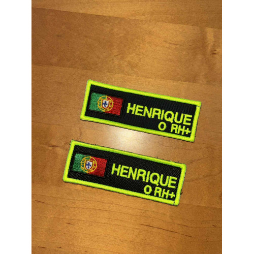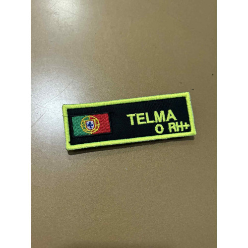 NOME BORDADO DE VELCRO COM BANDEIRA PORTUGAL E GRUPO SANGUÍNEO C/REBORDO